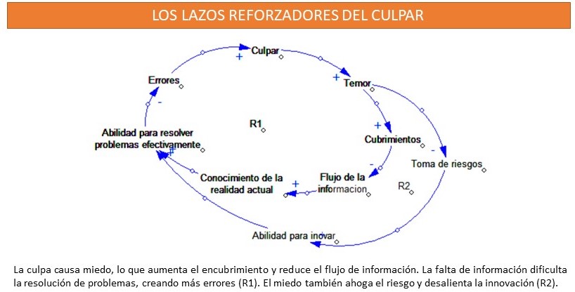 Como se muestra en “Los ciclos de culpar que se refuerzan”, el culpar incrementa al miedo, aumenta los encubrimientos y reduce el flujo de información al detener una conversación productiva. La falta de información oportuna y precisa sobre la realidad actual de una organización dificulta la resolución de problemas, lo que lleva a más errores y más culpa (R1).