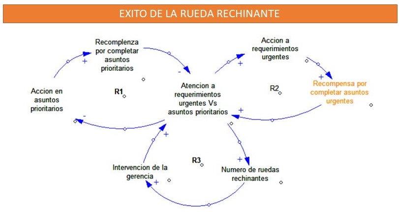 El diagrama “Éxito a la rueda chirriante” muestra cómo, en este caso, la atención del grupo SI a las solicitudes urgentes desvió los recursos de los elementos priorizados. Debido a que las recompensas por completar solicitudes urgentes aumentaron, las tareas urgentes continuaron recibiendo mayor atención (R2). Al mismo tiempo, las recompensas y el enfoque en las tareas priorizadas disminuyeron (R1). Finalmente, a medida que la gente se daba cuenta de que las solicitudes urgentes recibían mayor atención que los elementos priorizados, el número de “ruedas chirriantes”, o personas que promocionaban sus propios temas de agenda a la gerencia, proliferaba. Este desarrollo fue seguido por un aumento en los esfuerzos de la gerencia para tomar acción en esos ítems de la agenda, que promovieron aún más los ítems urgentes sobre los priorizados (R3).