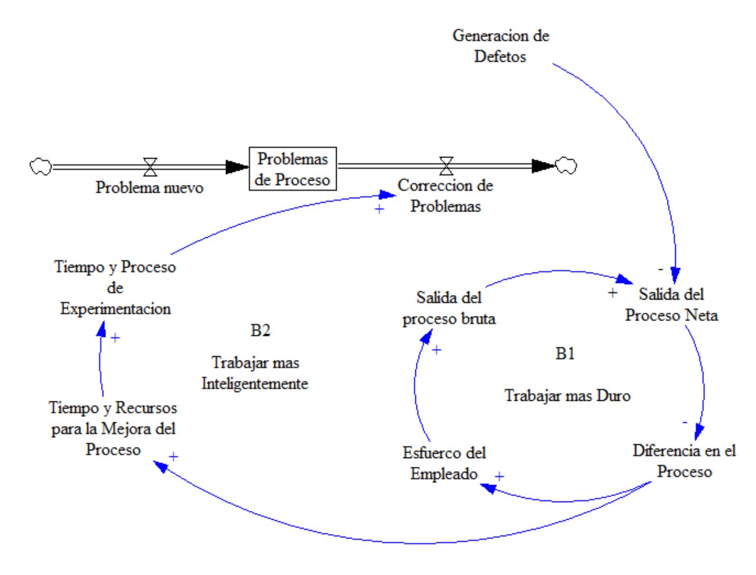 Los gerentes tienen dos opciones para aumentar el rendimiento neto para cumplir la meta. Pueden Trabajar Más Duro (B1) agregando capacidad, aumentando la semana de trabajo haciendo que la fuerza laboral trabaje más, y así sucesivamente. La otra opción es Trabajar Inteligentemente (B2) al capacitar a los empleados en técnicas de mejora y experimentación.